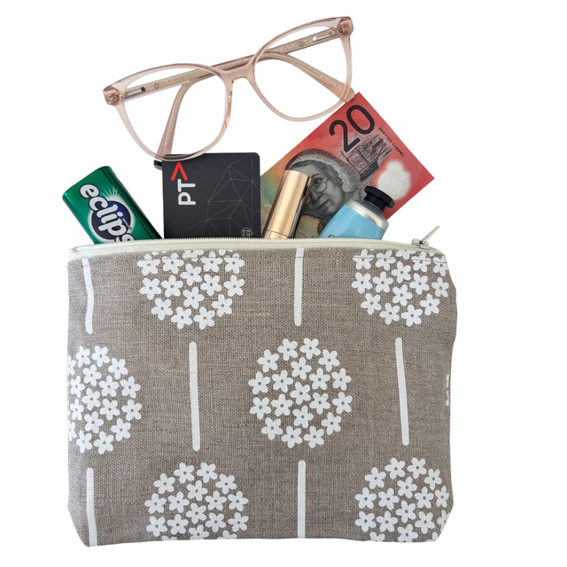 This zip purse featuring handprinted linen is great to have either to keep things together inside your bag and to take on your travels. It will fit your phone, keys, cards, cash, make up and other essentials.