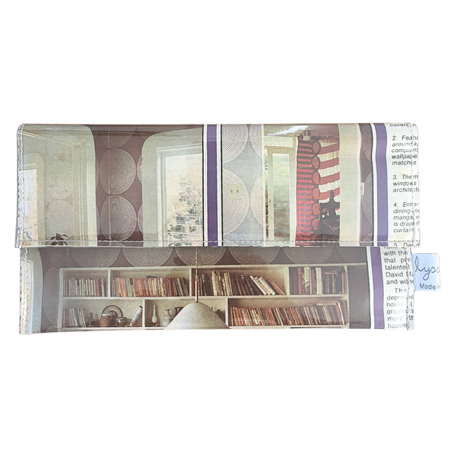 This slimline handmade wallet is made from the original pages of a 1970s home beautiful magazine and features interior inspiration to get a fresh new look for a problem house. The combinations of purple, olives an striking all wallpaper are a fantastic time capsule when interior design was a little less 'white on white'. The pages have been covered with pvc to protect the paper and is a true limited edition and collectable!