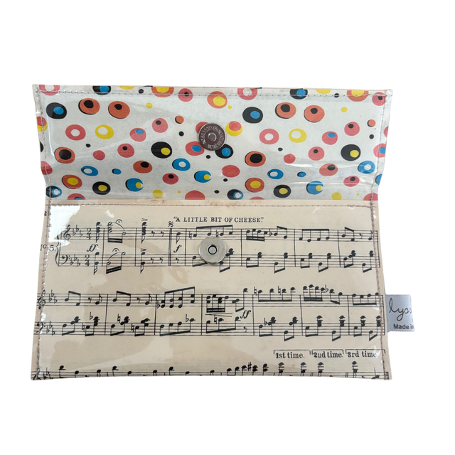 This wallet is made from an original page of sheet music from the 1940s 'Chappell & Co' Dance Album No 154 with the intriguing title of "A Little Bit of Cheese". It has been lined with vintage patterned paper in circles in yellow, orange, brown and white.