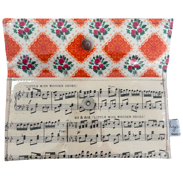 This wallet is made from an original page of sheet music from the 1940s 'Chappell & Co' Dance Album No 154 and features the music entitle 'Little Miss Wooden Shoes'* and 'Knitting Sextet'. It has been lined with a vintage patterned paper in a floral pattern with orange geometric shapes.