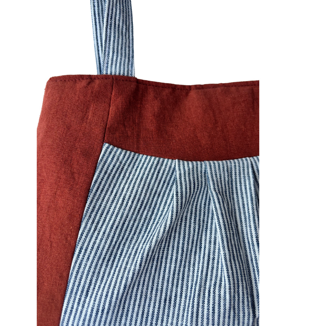 This compact tent shaped tote features deep terracotta pebble washed linen and a blue and white cotton twill pleated section to create a fresh contrast that is perfect to pair with a neutral wardrobe all year round.